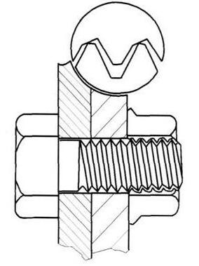 在施必牢螺母內(nèi)螺紋的牙底處有一個(gè)30度的楔形斜面,當(dāng)螺栓螺母相互擰緊時(shí),螺栓的牙尖就緊緊地頂在施必牢螺紋的楔形斜面上,從而產(chǎn)生了很大的鎖緊力。由于牙形的角度改變,使施加在螺紋間接觸所產(chǎn)生的向力與螺栓軸線成60度角,而不是像普通螺紋那樣的30度角。這就使得施必牢螺紋向壓力遠(yuǎn)遠(yuǎn)大于扣緊壓力,因此,所產(chǎn)生的防松摩擦力也就必然大大增加了。